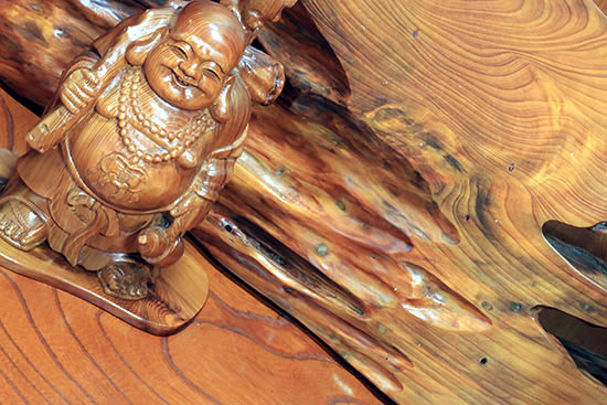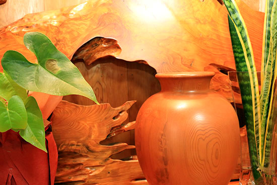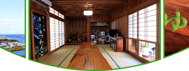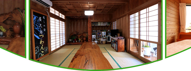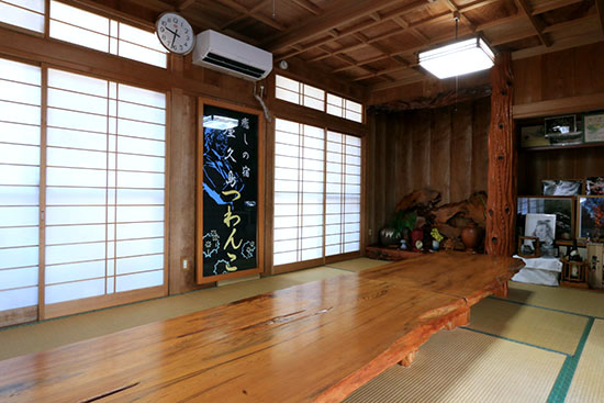 つわんこの食事処は、柱・天井・壁板のすべてが屋久杉材で造られ、